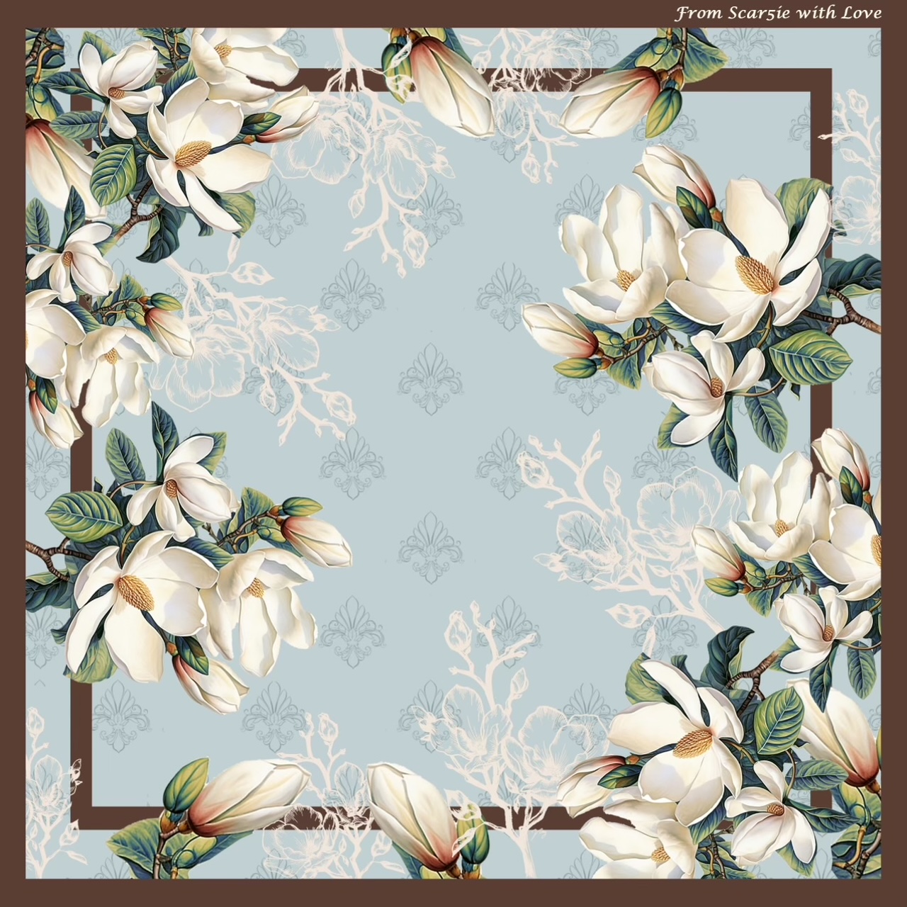 “Adorn yourself with this exquisite scarf showcasing the delicate beauty of the state flower, the magnolia, intertwined with the timeless Fleur-de-lis, French-inspired elegance capturing the rich French heritage of the region.”